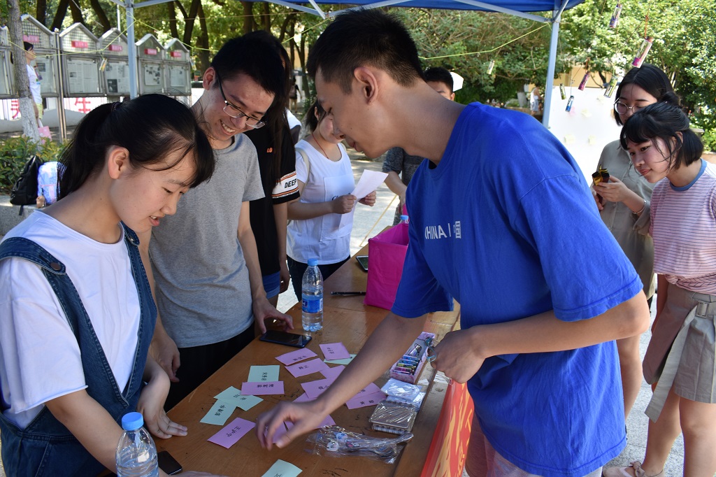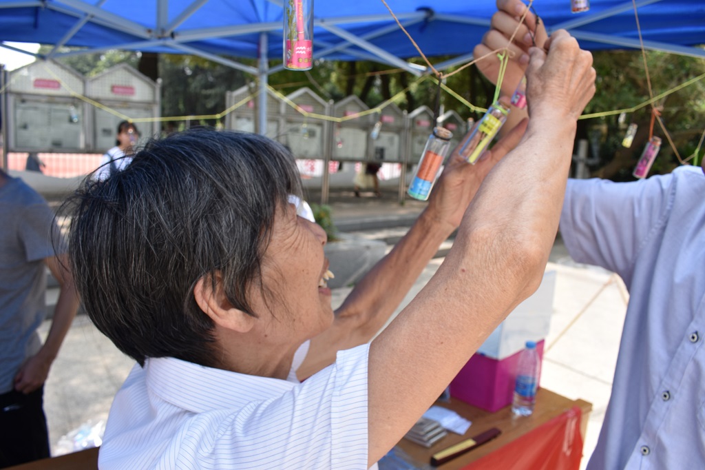活动中,路过的同学纷纷驻足,在志愿者们的热心引导下,或是提笔挥墨写下自己对母校六十年校庆的祝福,借那随风响动的漂流瓶传达自己对母校前景的期愿;或是参与进知识小游戏中,在游戏中加深自己对学校的了解。活动还吸引了两位老校友,他们体验了活动内容,讲述了一些学校的历史,表达了对此次活动的支持和鼓励。