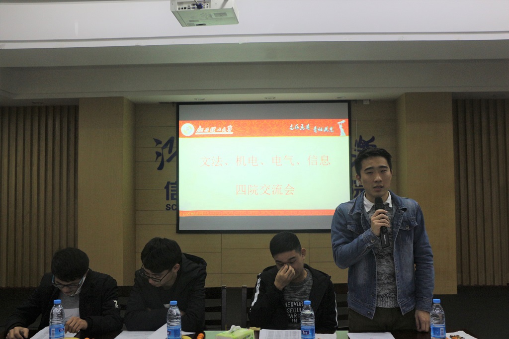 首先,主持人介绍今天到场的同学,学生会主席王冠超对其他三个学院同学的到来表示衷心的感谢,希望通过此次交流会每位学生会成员都能够有所收获,并积极的运用到实际工作当中。接着各学院学生会主席上台致辞,并做简短的自我介绍。